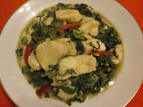 在鍋裡放橄欖油三湯匙、大蒜末二湯匙、辣椒絲半湯匙,用中火炒香蒜末,放入雪菜梗子的部份,改用大火快炒幾下,再放雪菜的葉子一起炒幾下,加入一杯熱開水,把醃好的魚片,平均放到雪菜的上面煮一下,連雪菜一起翻個面再煮一下,把魚和雪菜一起煮熟,試一試味道,就可以裝盤上菜。
