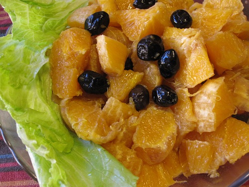 請將柳橙的外皮先洗乾淨,去外皮以後,切成任何自已喜歡的形狀,放進容器裡,再放進黑色橄欖「含湯汁」,淋上橄欖油三湯匙,加入鹽、黑糊椒粉一起攪拌均勻。