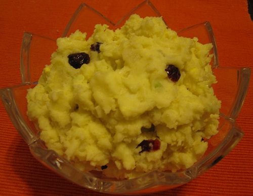 請把馬鈴薯泥和搗碎的蛋黃、西洋芹的細丁、蘋果的細丁,放在一個大的容器裡,加入一杯美乃滋和蔓越梅乾二湯匙,攪拌均勻,就完成了美味的馬鈴薯沙拉。