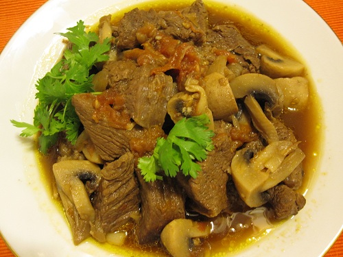 請把切成塊狀的牛肉,比較有脂肪的部份先放到鍋裡,再放蒜末三湯匙和洋蔥絲,用中火把牛肉和蒜末、洋蔥絲炒香,再放入比較沒有脂肪的牛肉塊一起炒香,把己經去過外皮的蕃茄和醬油半碗放入鍋裡,和牛肉一起煮三十分鐘,再放蘑菇一起煮二十分鐘,加鹽一茶匙半,攪拌均勻試一試味道,加一點香菜更美味。