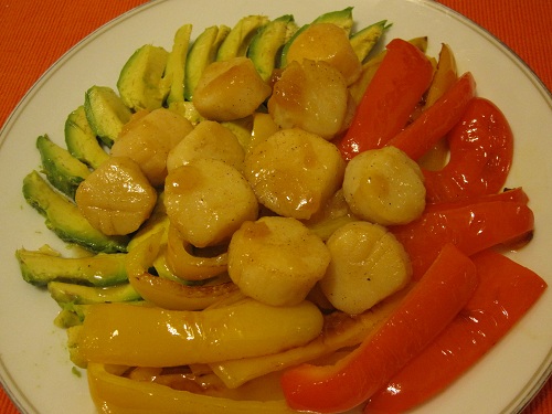 請在平底鍋裡再放橄欖油一湯匙半,熱鍋以後放入干貝,用中火把干貝兩面煎熟,加鹽調味關火,把煎熟的干貝放到盤裡,干貝汁淋到酪梨的上面,相常美味哦!