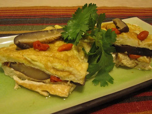 把煎好的豆腐留在平底鍋裡,放入切成條狀的香菇和枸杞子,把四分之三茶匙的鹽平均撒在香菇的上面,把盤裡的煎蛋放到香菇的上面,加入熱開水半杯蓋上鍋蓋,用中小火大約煮十分鐘就可以關火,切成六等份裝盤放上香菜,就完成了色香味俱全的健康美食。