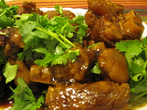 把乾淨的豬腳和配料,全放到鍋內蓋上鍋蓋,先開中火,等米酒和醬油滾開以後轉小火,每隔十五分鐘翻面一次(以免燒焦),大約一個半小時就可以關火。