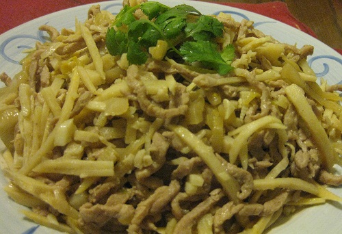 在鍋裡放蒜末一湯匙、橄欖油二湯匙,用中火把蒜末炒成金黃色,放入冬筍絲把冬筍絲炒軟炒熟,放回炒好的酸菜絲,再加入半碗熱開水,在鍋裡和酸菜、筍絲一起翻炒幾下,等收乾湯汁時放回肉絲,攦上白胡椒粉,和酸菜筍絲拌炒均勻關火,就可以起鍋上菜。