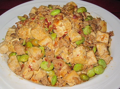 放入辣椒醬三湯匙,和絞肉一起再炒一下,把切成小方塊的豆腐、毛豆和醬油五湯匙,放到鍋內一起快炒均勻,加入半碗熱開水,攪拌一下,關小火悶煮十分鐘。起鍋前灑下白胡椒粉、鹽一茶匙拌勻,就可關火上菜。