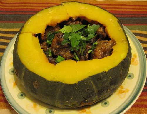 請將南瓜外皮洗乾淨,在蒂頭下三公分處橫切,把南瓜子取出,放進醃好的小排骨,再把切下的南瓜蓋上去,放到圓盤裡,用電鍋蒸熟(外鍋請用五杯水)。