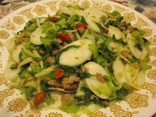 在鍋裡放橄欖油八湯匙、大蒜末二湯匙、薑末二湯匙、香菇絲二湯匙和豬絞肉半磅,用中火炒香蒜末、薑末、香菇絲和豬絞肉,放入年糕和冬荀絲,把年糕炒透,放入雪菜梗子的部份,改用大火快炒,再放雪菜的葉子和枸杞子,一起炒幾下,把雞湯罐頭倒進鍋裡,和年糕一起煮滾,要不斷的翻炒鍋底才不會燒焦,等湯汁收的時候,放入鹽二茶匙拌勻,就完成了雪菜炒年糕。