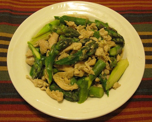 在鍋裡放薑末一湯匙和橄欖油三湯匙,用大火把薑末炒香,放入雞肉片一起炒幾下,再放蘆荀到鍋裡一起炒,把蘆荀炒到半熟的時候,加入熱開水半杯一起炒到收汁時,加鹽一茶匙拌勻關火,就可以裝盤上菜。
