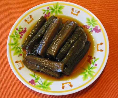 把切成長條狀的小黃瓜,放進鍋裡和醬汁一起煮滾後大約二分鐘,把小黃瓜撈起來瀝乾醬汁放涼,把醬汁再煮滾以後關火放涼。