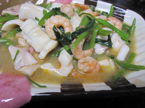 在鍋裡放橄欖油二湯匙和薑絲二湯匙,熱鍋就把空心菜梗子的部份放到鍋裡先炒軟,再放空心菜的葉子一起炒幾下,把醃好的魷魚和蝦仁一起放到鍋裡,加鹽一茶匙半和熱開水一杯拌炒均勻,等魷魚片捲成半圓形,蝦仁變成紅色時,就可以關火上菜。