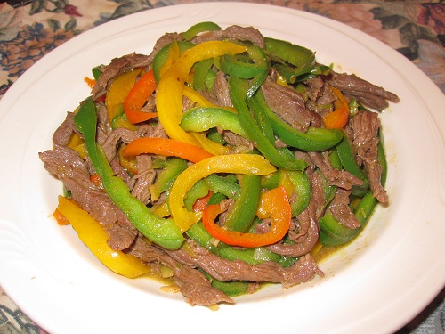 在鍋裡放橄欖油二湯匙,開大火熱鍋,放入薑絲把薑絲炒香,放入彩椒絲繼續用大火快炒到八分熟,加入熱開水和鹽一茶匙拌均,放入炒到八分熟的牛肉條一起快炒一下,就可以關火裝盤上菜。
