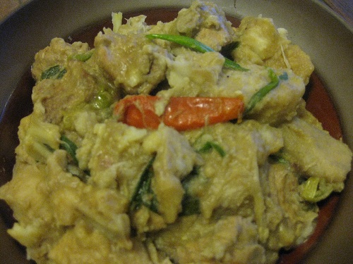 等芋頭煮到半泥狀湯汁收的時候,放入綠色的蔥尾,充份攪拌一下,試試味道就可以上菜了。